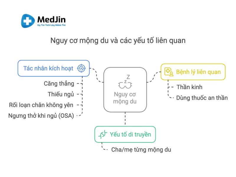 Yếu tố di truyền cũng đóng vai trò quan trọng: nếu cả cha mẹ đều từng bị mộng du, nguy cơ con cái mắc tăng đến 61%. Ngoài ra, các tác nhân như căng thẳng, thiếu ngủ, rối loạn chân không yên, hoặc ngưng thở khi ngủ có thể kích hoạt mộng du ở cả trẻ và người lớn.